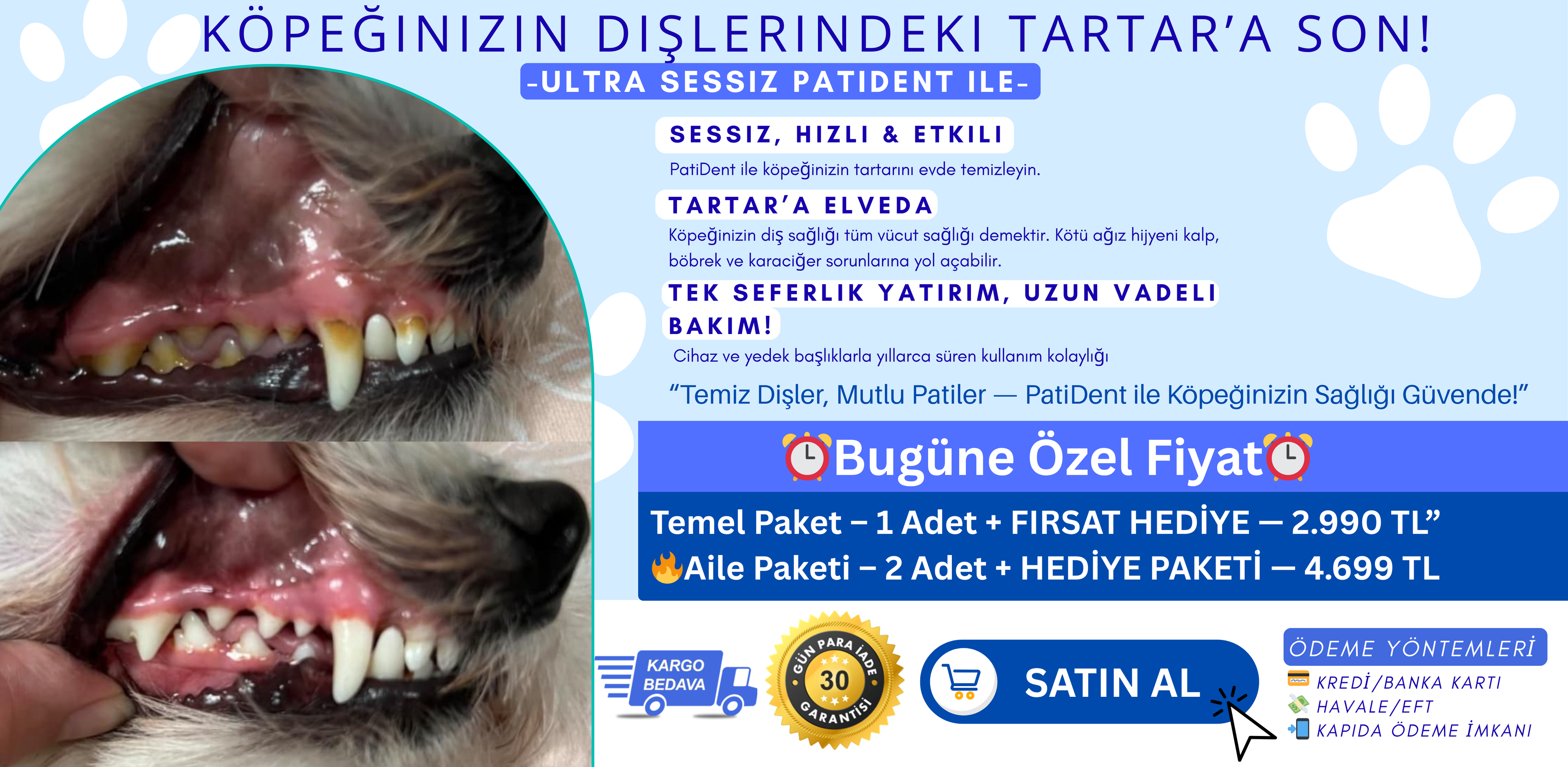 Köpeğinizin dişlerinde oluşan kalın tartar ve plağı, pahalı veteriner ücretleri ödemeden, köpeğinizi anestezi etkisine sokmadan, PatiDent sayesinde evinizde kolayca temizleyebilirsiniz.